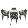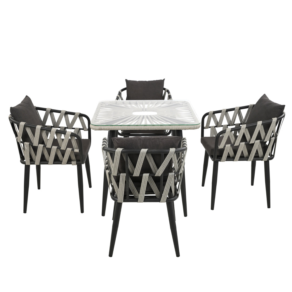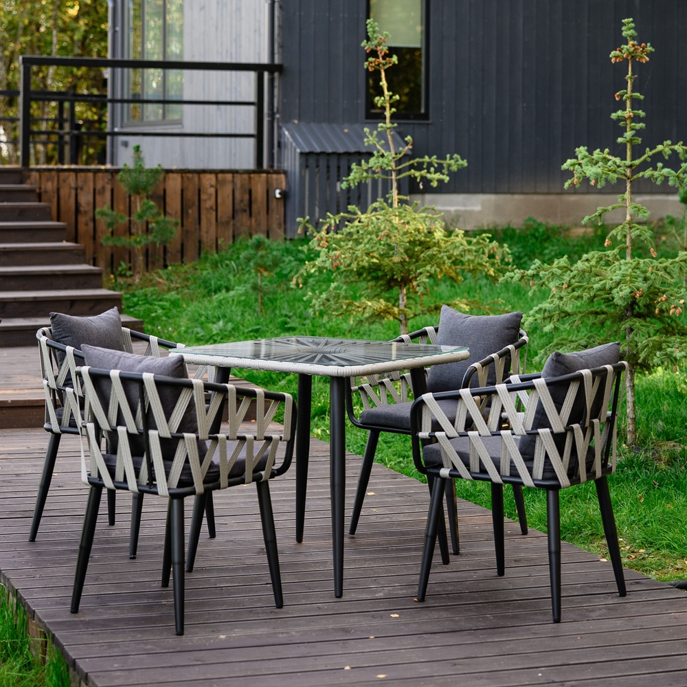 Комплект состоит из четырех стульев с подушками и обеденного стола с квадратной столешницей из закаленного стекла.