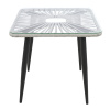 Садовый стол имеет стальной каркас, окрашенный порошковой краской и оплетенный искусственным ротангом, и квадратную столешницу из закаленного стекла. Плетеная текстура ленты придаёт мебели элегантный вид, а закаленное стекло добавляет прочности и устойчивости.