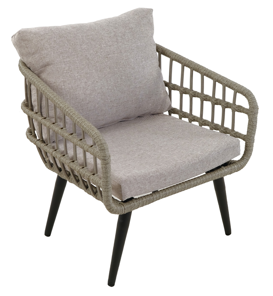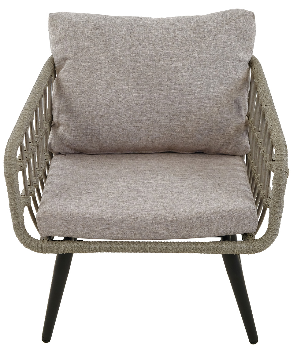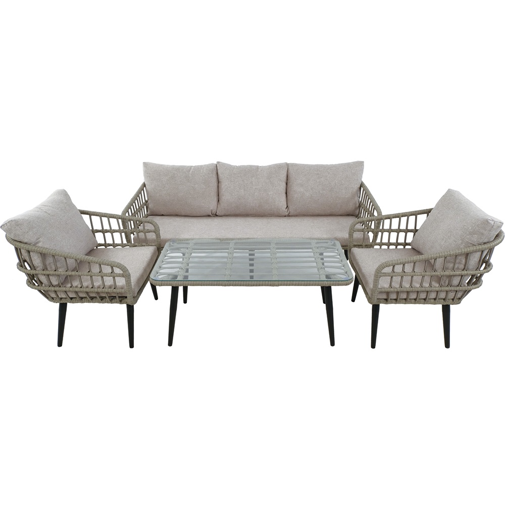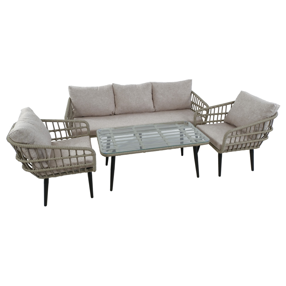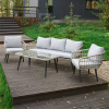 Комплект включает в себя удобные диван с подушками, 2 кресла с подушками и журнальный стол, которые создают комфортную зону отдыха на свежем воздухе.