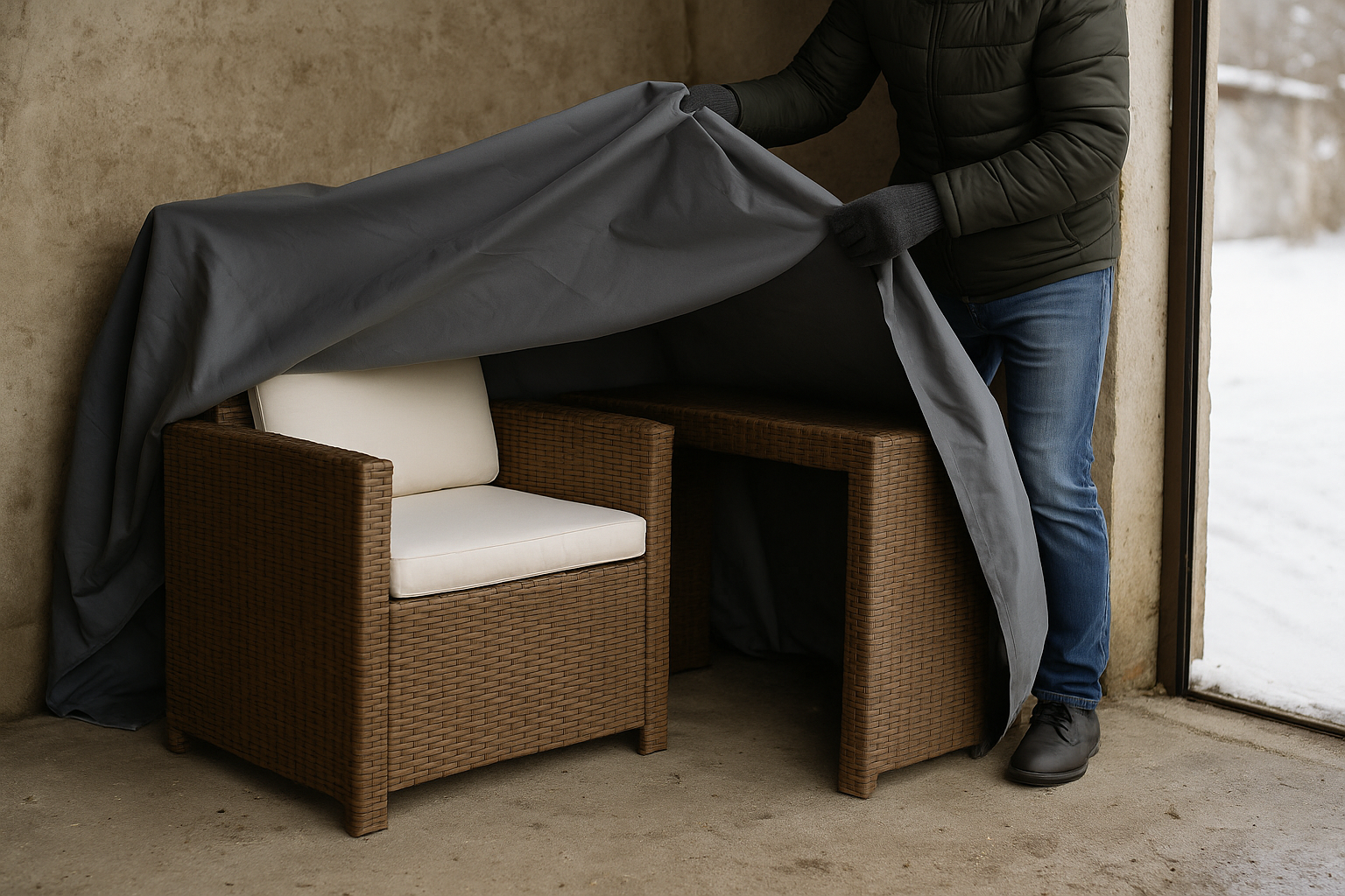 Чтобы хранить садовую мебель из ротанга зимой на улице, удобно использовать специальные чехлы. Чехол защищает мебель от осадков и грязи, помогает дольше сохранять внешний вид и долговечность материала. Подойдут плотные чехлы из ткани или комбинированные модели, где верх защищает от влаги, а внутренняя часть дает воздуху циркулировать.